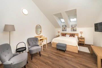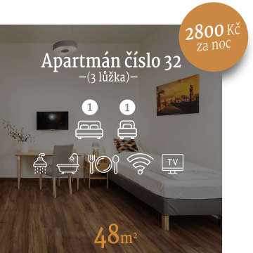 Přichystali jsme pro Vás plně zařízené apartmány. Nezáleží na tom, jestli si zvolíte 3lůžkové ubytování nebo velký 4pokojový apartmán, všude na vás čeká příjemný obývací prostor nebo kuchyně s posezením (plně a moderně vybavená všemi spotřebiči), útulné ložnice a moderní koupelna. Po dobu pobytu Vám bude také k dispozici televize s plochou obrazovkou a Wi-Fi zdarma. Prohlédněte si interiéry v naší galerii.
